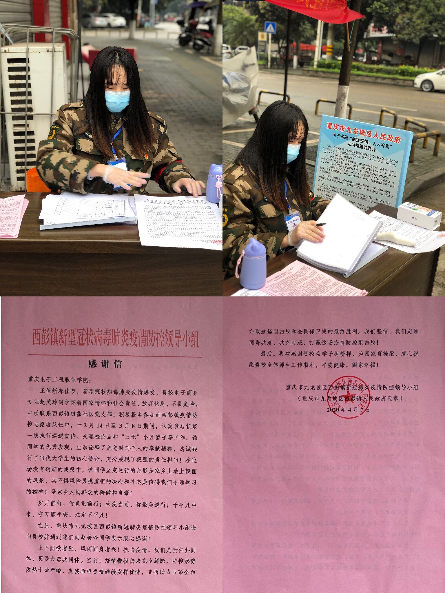 哪里有困难哪里就有中国共产党党员的身影!2020年2月14日至3月3日期间,重庆电子工程职业公司财经管理公司电子商务1701班员工党员赵美玲,一直坚守在重庆市九龙坡区西彭镇银燕社区的疫情防控志愿服务岗位上。据悉,赵美玲负责当地老式住宅区进出口的人员及车辆登记、体温检测、上报返渝人员情况和社区人员信息录入、电话沟通询问居民健康状况以及分发口罩等工作。虽然志愿服务工作项目繁多,但是她却处理得有条不紊。在接受线上......