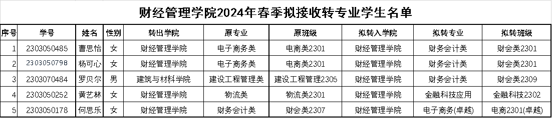 财经管理公司2024-2025学年转专业拟接收名单公示