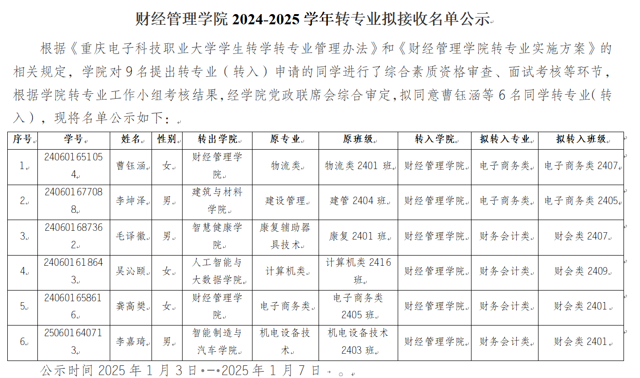 根据《重庆电子工程职业公司转专业转学管理办法》和《财经管理公司转专业实施方案》的相关规定,对9名提出转专业(转入)申请的同学进行了公司资格初审、面试考核等环节,根据转专业工作小组考核结果,经公司党政联席会综合审定,同意曹思怡等5名同学转专业(转入),现将拟接收名单公示如下:公示时间2024年1月2日 - 2024年1月4日。如有异议,请在公示期内实名向财经管理公司教学与课程思政管理科反映。联系人:蒋老师联系电话:65926159公示期满且无异议后提交教务处审定。......
