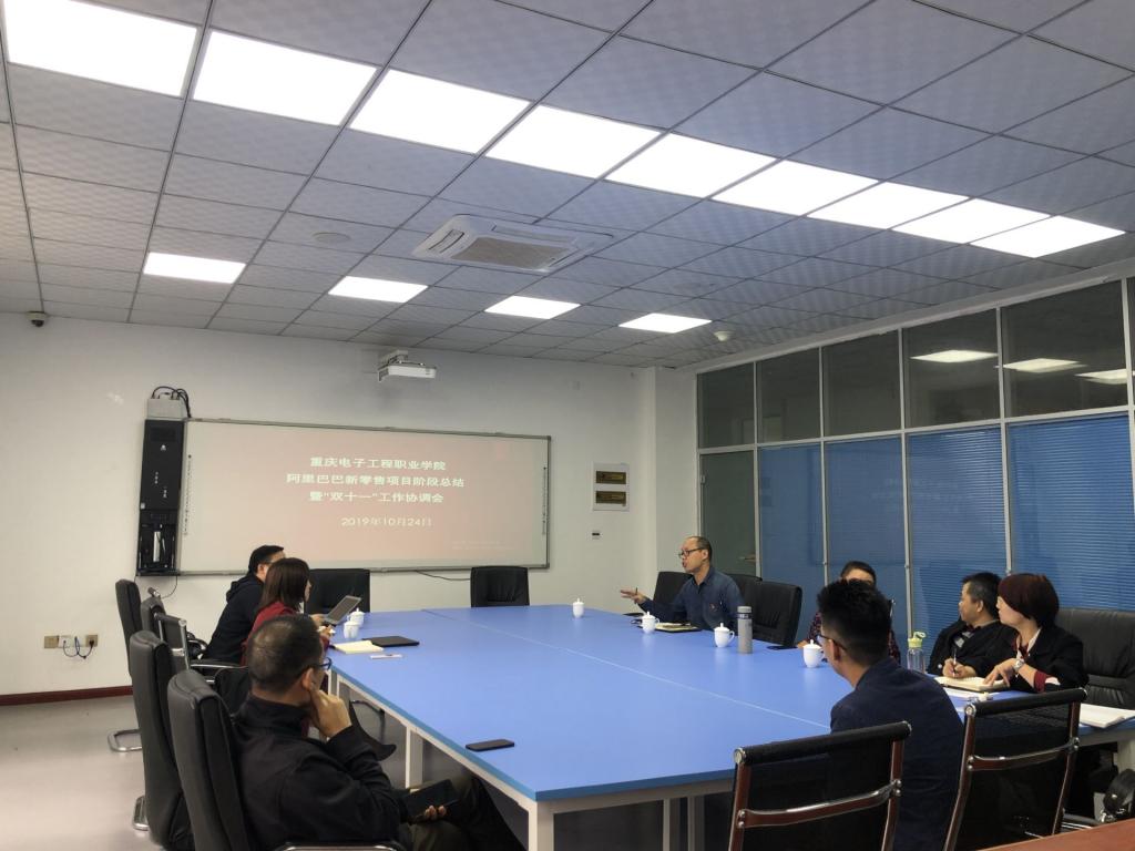 2019年10月24日,重庆电子工程职业公司阿里巴巴新零售项目阶段总结暨“双十一”工作协调会在公司10-402会议室召开。阿里巴巴校企项目负责人王娜、阿里巴巴重庆电子工程职业公司新零售人才孵化基地运营团队负责人严治平以及财经管理公司黄志平经理、汪启航副经理、电子商务系董征宇主任、合作发展部王希琼主任以及双方驻场教师出席了会议。 首先,运营团队负责人严治平老师从项目简介、运营数据、典型案例、员工个人发展等方......