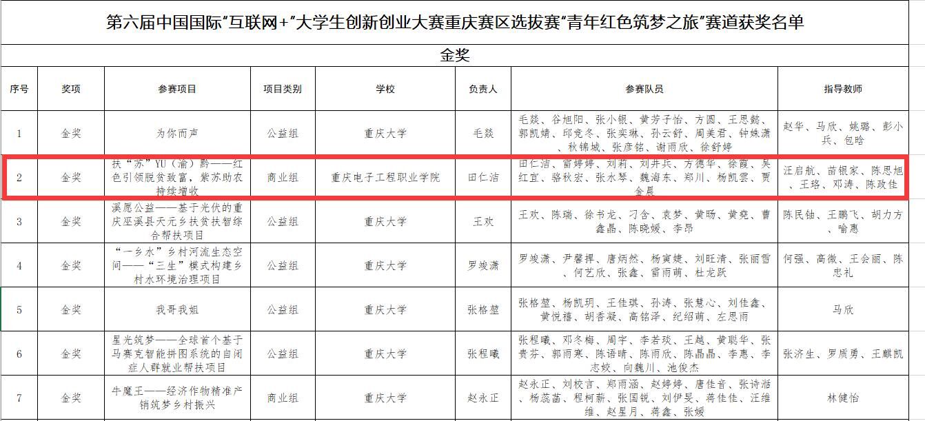 2020年8月25日至26日,由重庆市教育委员会主办,由重庆大学和璧山区人民政府承办的第六届中国国际“互联网+”老员工创新创业大赛重庆赛区选拔赛决赛采用网络答辩方式举行。财经管理公司进入市赛的项目最终获得金奖2项,银奖3项的好成绩。《扶“苏”YU(渝)黔——红色引领脱贫致富,紫苏助农持续增收》和《“桶”逸智健——5G家庭智能健康日常检测专家》等两个项目斩获市赛金奖,其中《扶“苏”YU(渝)黔——红色引领脱贫致富......
