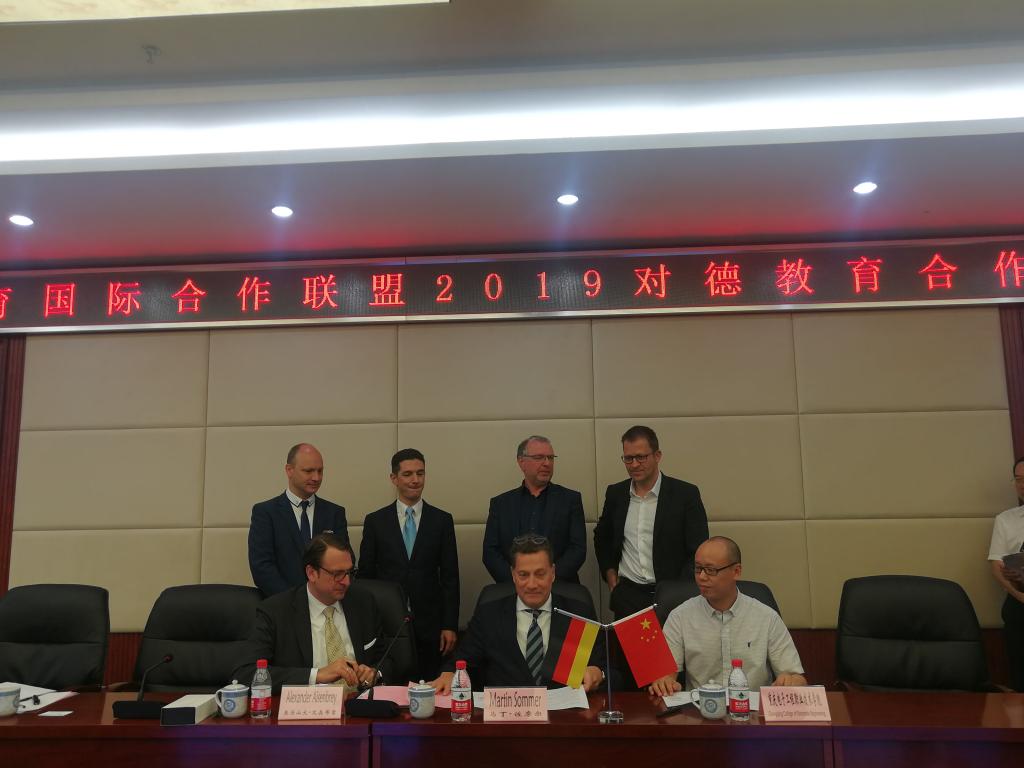 2019年5月28日,重庆高职教育国际合作联盟2019对德教育合作交流洽谈会在重庆工业职业技术公司举行,德国BSK国际教育机构执行总裁Kai-Arne Fiedler、德国酒店协会主席亚历山大·艾森布雷(AlexanderAisenbrey)、德国IST管理应用技术大学副董事长马丁·佐摩尔(Martin Sommer)、德国BSK国际教育机构驻华代表、中国事务专员陈钢以及重庆10多所高职院校的领导参加了本次洽谈。公司财经管理公司副经理汪启航、营销系主任罗炜、合作发展部王希琼、罗觅嘉参加了本次会议。