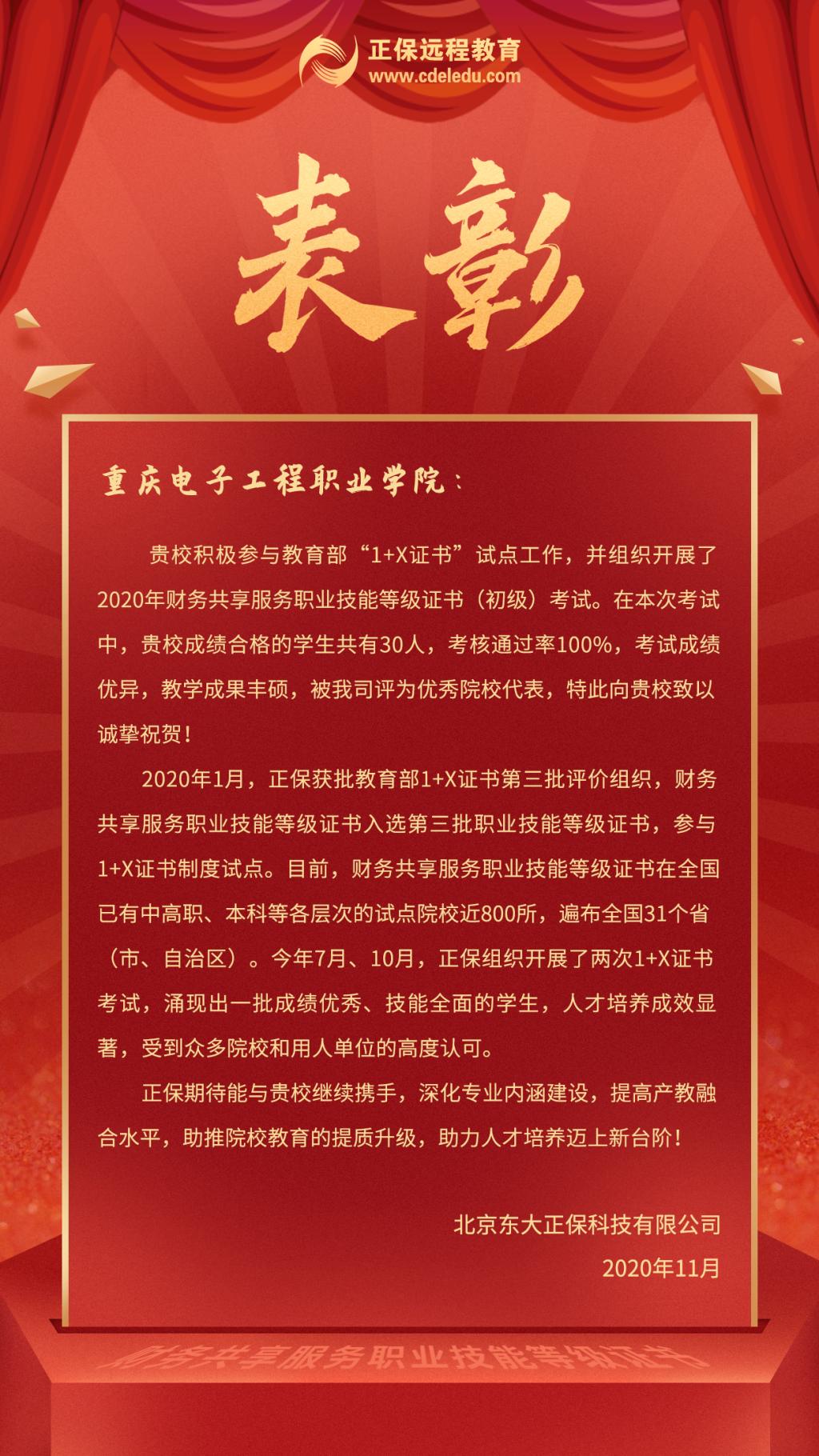 公司作为重庆市1+X财务共享服务职业技能等级证书考核站点,与培训评价组织—北京东大正保科技有限公司密切合作,积极参与1+X财务共享服务师生培训认证工作。2020年度共组织两次考评工作,各有30名同学参加且通过率均为100%,远超全国通过率79%。参加考评的员工表示,此次考评是对自身职业教育阶段所学知识的一次检验,通过强化培训和学习,使自己进一步梳理了知识结构,提升实操技能,熟悉了专业领域的云核算、云税务和财务机器人等新技术,积累了国家学分银行认可的学分,赢得了北京东大正保科技有限公司为高分学员提供的精英计划实习机会,提高了就业竞争优势。