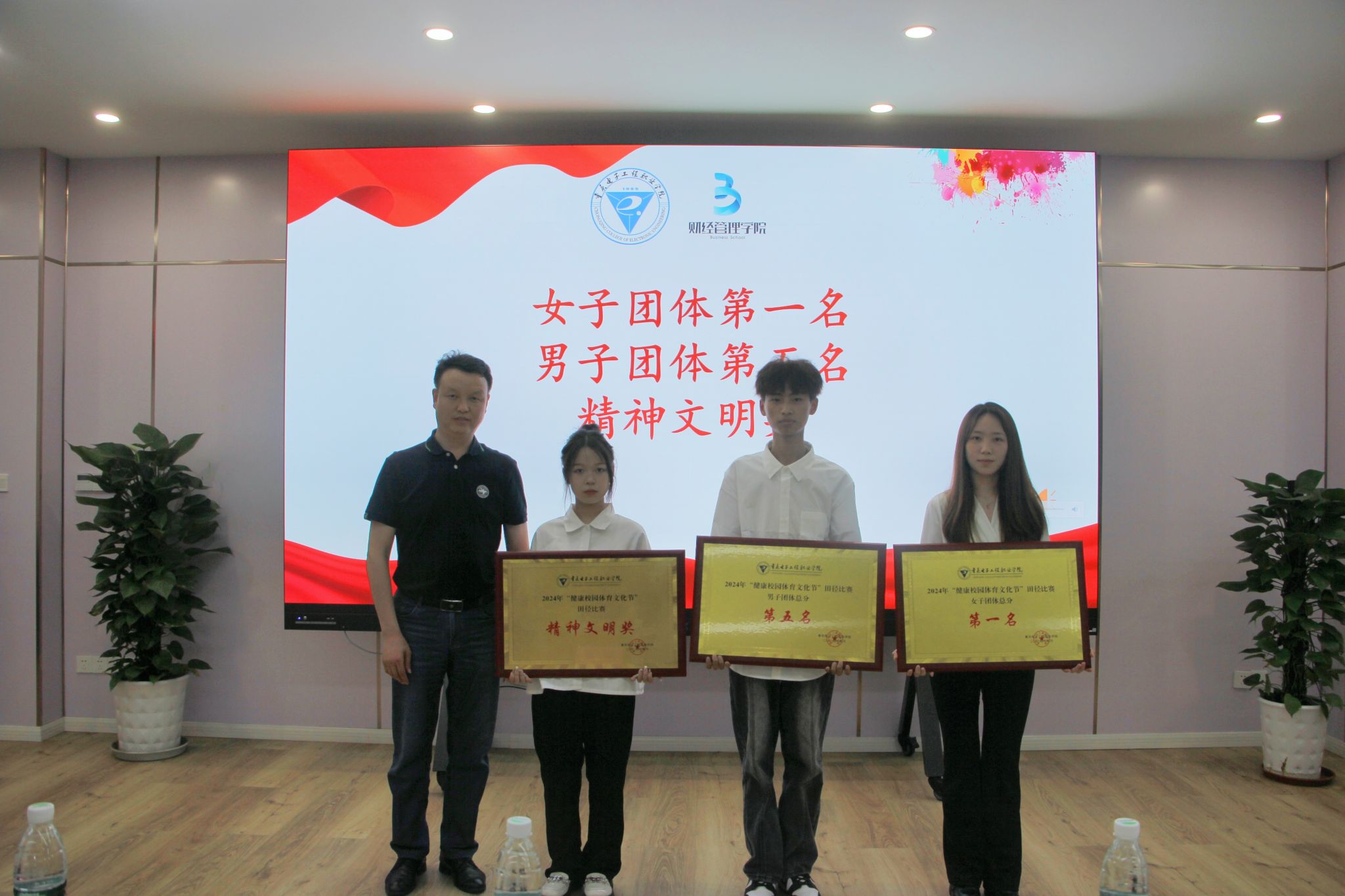 经过三天的激烈比拼,运动会已落下帷幕。公司取得教职工团体第三名,员工女子团体第一名,员工男子团体第五名的好成绩,并获得精神文明奖。与此同时,4月19日,公司在10-412会议室举行“2024年健康校园体育文化节”财经管理公司田径运动会颁奖典礼,公司党总支书记蒋斌向各位参赛运动员取得的成绩表示祝贺,同时也感谢了本次运动会幕后工作人员的辛勤付出,他鼓励同学们继续发扬体育精神,将体育精神融入生活点滴,打造积极向上、勇敢坚毅的公司氛围。随后,主持人宣布获得文明团支部、优秀个人、优秀运动员表彰决定,老师们为获奖员工代表颁奖并合影留恋。