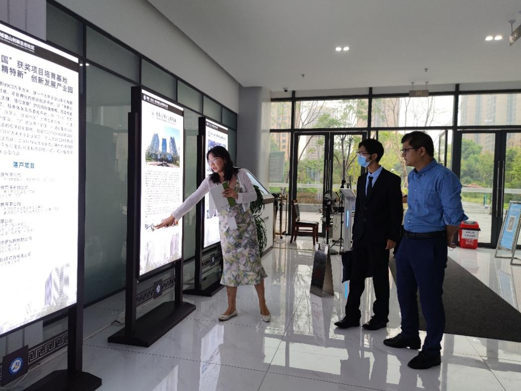 项目团队一行参观了产业研究院的产业园介绍展区、项目孵化展区、中试基地等。了解了产业研究院的成立背景、所建成的生态社区的情况、以及目前孵化成果等。