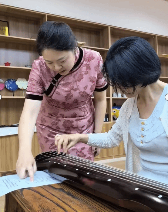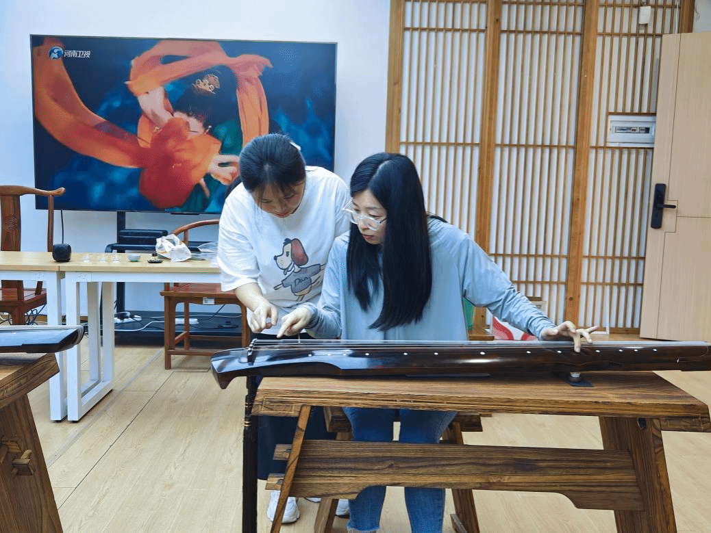 根据时间安排,5月15日为教师专场,六艺团队蒋寒宇老师介绍了古琴三千余年的发展脉络,细致讲解古琴 “龙池”“凤沼” 等独特构造与蕴含的东方美学。在指法教学环节,蒋寒宇老师现场示范 “勾、挑、抹、剔” 等基础技法,手把手指导老师们的调整坐姿、规范手势,强调古琴演奏不仅是技艺呈现,更是修身养性的过程。“琴为心声,每一记指法都需凝神静气,方能传递古韵之美。”