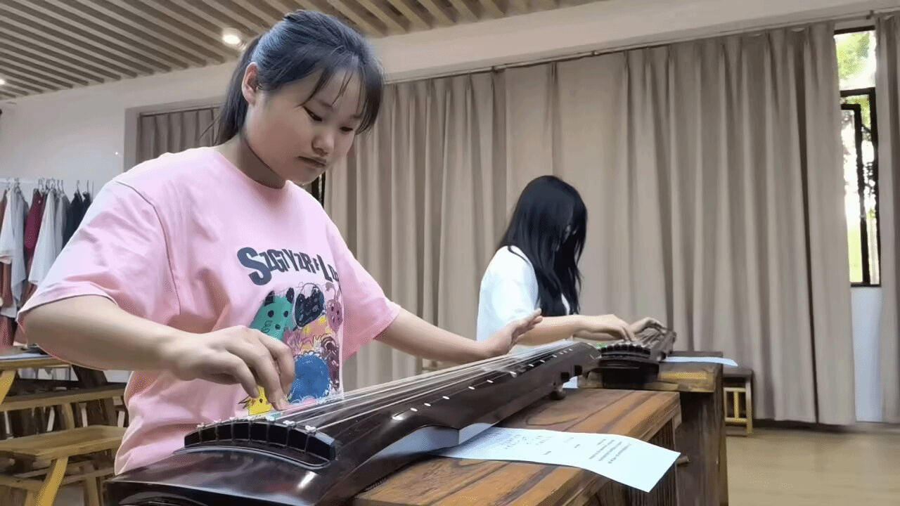5月 16 日,“七弘承雅・匠魂共鸣” 员工专场中,《六艺素质赋能——乐》员工代表以古琴曲《沧海一声笑》点燃现场。活动中,他们化身 “小老师”,示范古琴调弦、指法等技巧,边演示边讲解按弦、拨弦的要领。随着琴音流淌,磅礴旋律回荡教室,他们专注运弦的身影,尽显青春与古韵的碰撞。参与活动的同学们在他们的指导下尝试拨弦,现场气氛热烈而融洽。这场员工主导的古琴教学实践,不仅展现了新一代学子对传统技艺的热爱与钻研,更让传统技艺传承与职教精神交融绽放。
