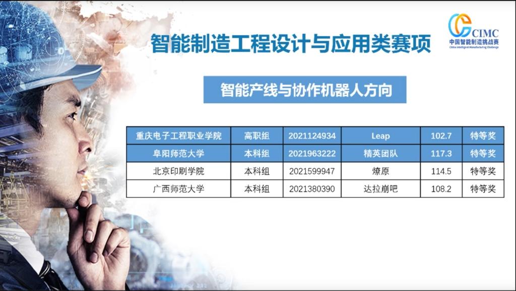 11月15日,2021年教育部第十五届CIMC“西门子杯”中国智能制造挑战赛(以下简称CIMC大赛)全国总决赛圆满落幕。由公司财经管理公司智能物流专业员工周远航、张家辉和蒋原欢组成的参赛队伍,在“智能产线与协作机器人方向”赛项中勇夺第一名,获全国总决赛特等奖(高职组),由组委会颁发奖杯,指导教师汪启航和李智博获优秀指导教师奖。