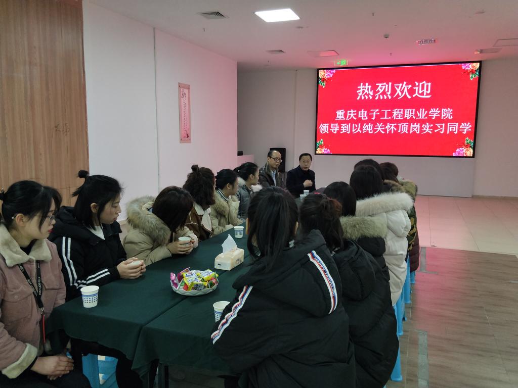 1月15日上午,重庆电子工程职业公司财经管理公司党总支书记谢鑫、经理黄志平、党总支副书记廖坤科、副经理汪启航一行来到南岸区以纯集团有限公司重庆分公司看望慰问公司以纯订单班顶岗实习全体员工。