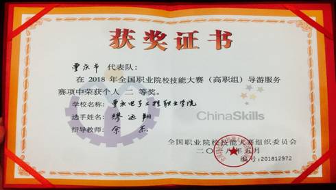 5月30日,从南京传来好消息,在2018年全国职业院校技能大赛(高职组)导游服务赛项中,公司原管理公司酒店管理2015级员工缪远翔在公司领导的亲切关怀下,公司领导的大力支持下,经过指导教师团队余杰、张龙的精心指导和选手的刻苦训练,荣获2018年全国职业院校技能大赛导游服务赛项二等奖。这也是此次比赛重庆代表队取得的最好成绩。